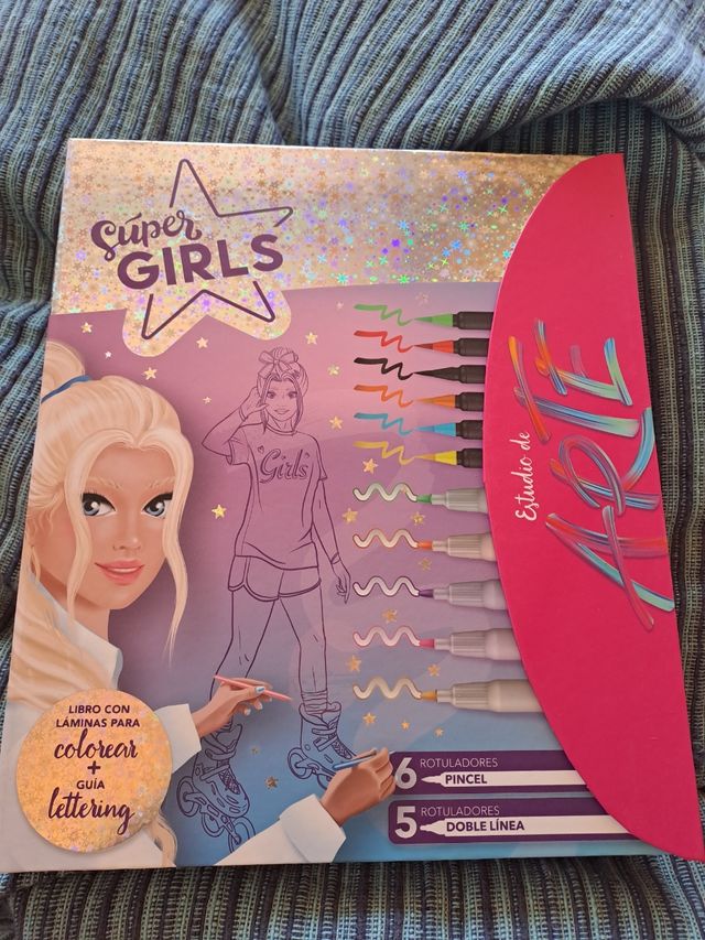 Detalles del productoLibro para colorear Super Girls con láminas para colorear y lettering. Incluye 6 rotuladores pincel y 5 rotuladores doble línea.