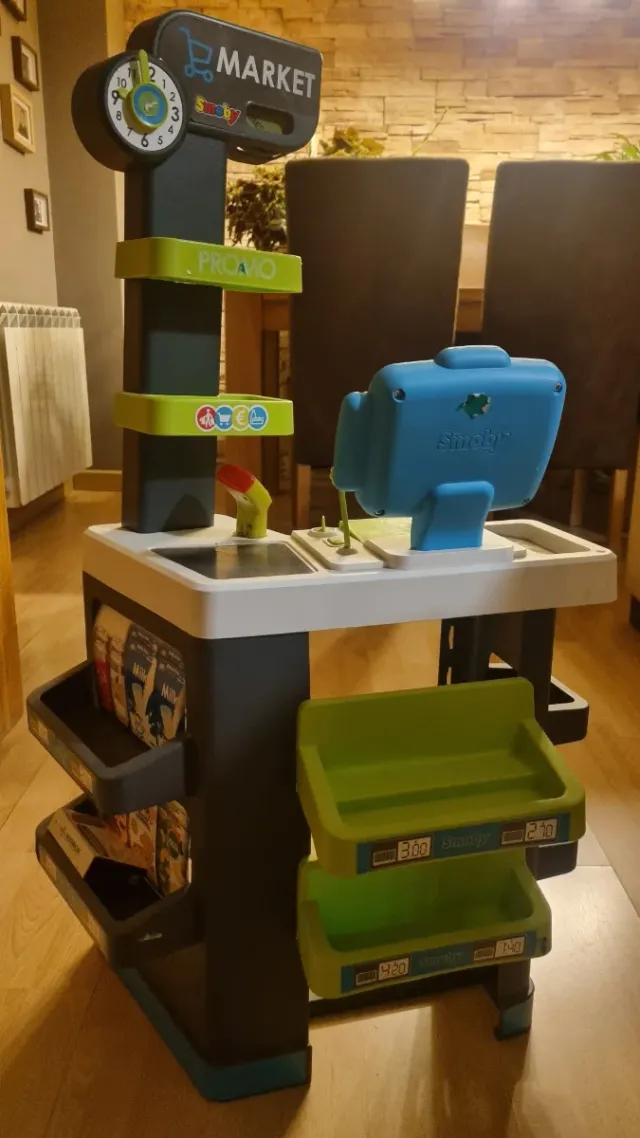 Supermercado de juguete Smoby Incluye: - Caja registradora y balanza. - Estanterías para colocar productos.