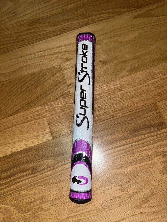 Empuñadura de golf SuperStroke con un diseño llamativo. - Color blanco con detalles en morado y negro. - Logotipo de SuperStroke visible.