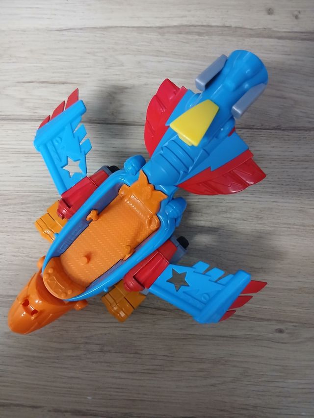 Set de dos vehículos de Superthings. - Vehículo principal de color azul, rojo y amarillo. - Vehículo secundario de color naranja y azul.