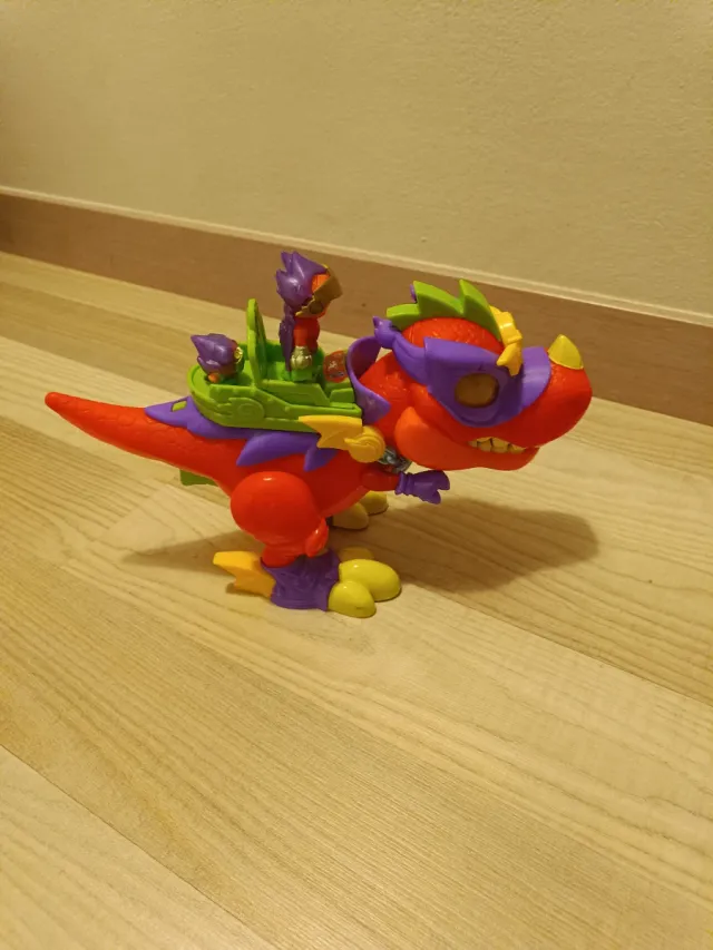 Divertido juguete Superdino de Superthings. - Figura de dinosaurio de color rojo. - Accesorios de color verde, morado y amarillo. - Incluye figuras pequeñas.