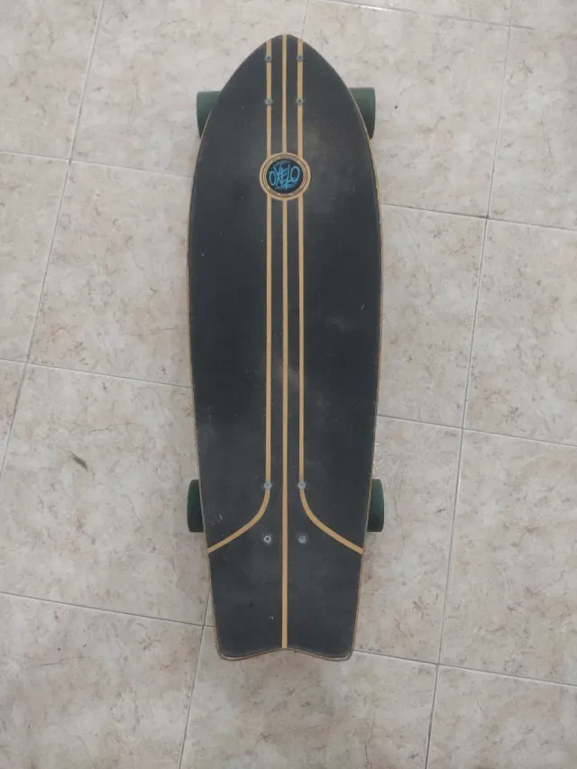 Surfskate Oxelo con diseño deportivo. - Tabla negra con detalles en color dorado. - Ruedas verdes.