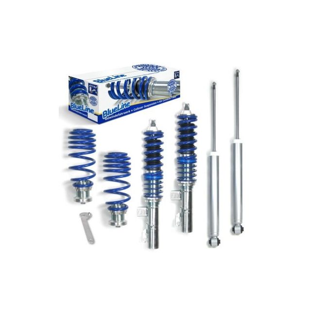 Los kits de suspensión BlueLine coilover son componentes de suspensión específicos para automóviles de alto nivel, con una reducción en el frente de los ejes entre 20 y 55 mm y en la relación entre 30 y 50 mm. Los kits tienen una gran absorción de fuerza transversal. Altura ajustable Frontal 20-55mm / Trasera 30-50mm.