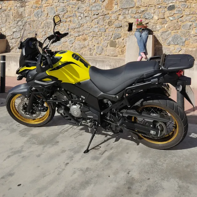 Detalles del productoMoto Suzuki V-Strom 650 XT en llamativo color amarillo y negro.