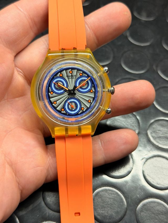 Detalles del productoReloj Swatch con diseño deportivo y correa naranja.