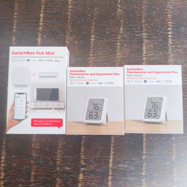 Detalles del productoSe vende un kit de SwitchBot que incluye el Hub Mini y dosTermómetro e Higrómetro Plus. El Hub Mini es un control remoto infrarrojo todo en uno para el hogar inteligente. El termómetro e higrómetro mide la temperatura y la humedad.