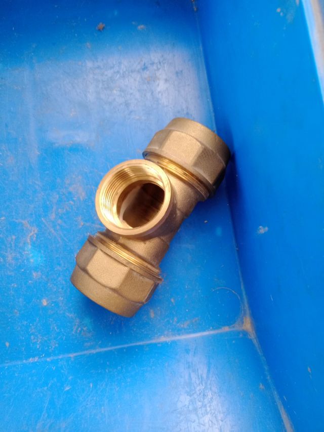 Se vende T de latón para tubería de polietileno. Por cierre de negocio. - Material: Latón y polietileno. - Rosca hembra. - Medida: 40 mm.