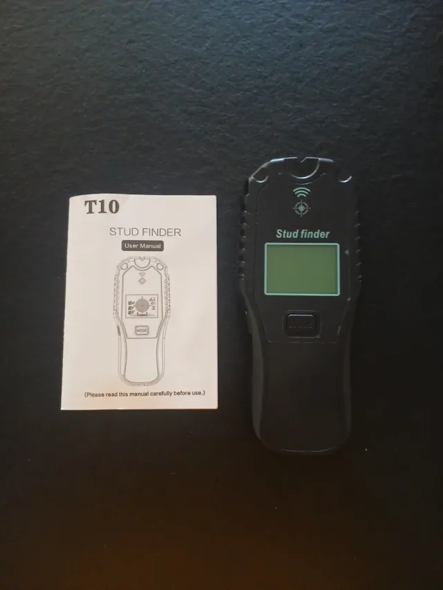 Detector de metales y cables T10, ideal para trabajos de bricolaje y construcción. Incluye manual de usuario. - Pantalla LCD. - Botón de modo. - Diseño ergonómico.
