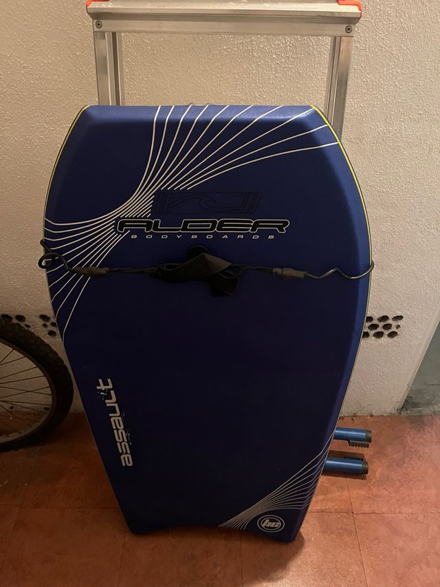 Tabla de bodyboard marca Alder, modelo Assault. - Color azul con diseño de líneas blancas. - Incluye leash. - Dos aletas azules en la parte inferior.