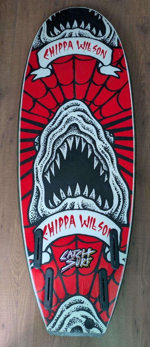 Tabla de surf Catch Surf Odyssey de 5 pies. - Diseño llamativo con tiburón y telaraña. - Modelo CHIPPA WILSON en la tabla. - Entrego con 4 quillas originales