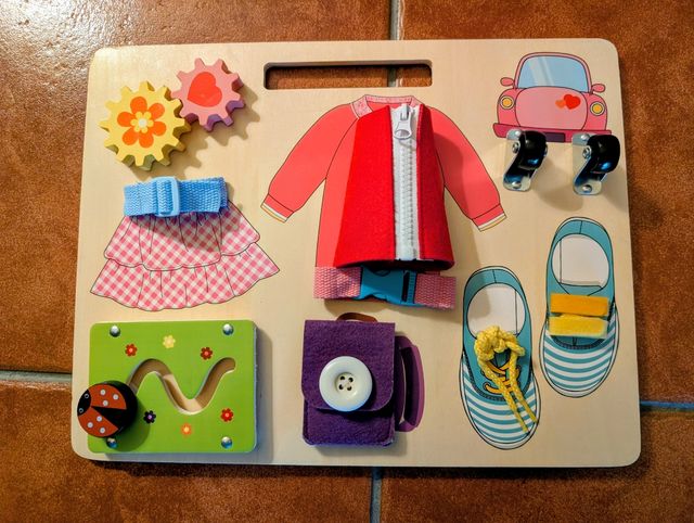 Detalles del productoTabla de actividades de madera con varios elementos para el desarrollo de habilidades.