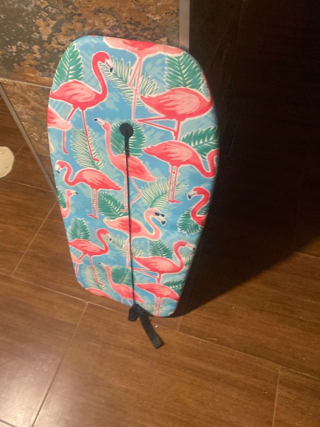 Tabla de agua con un divertido diseño de flamencos rosas sobre fondo azul y hojas verdes. - Diseño vibrante y colorido. - Ideal para disfrutar en la piscina o la playa.
