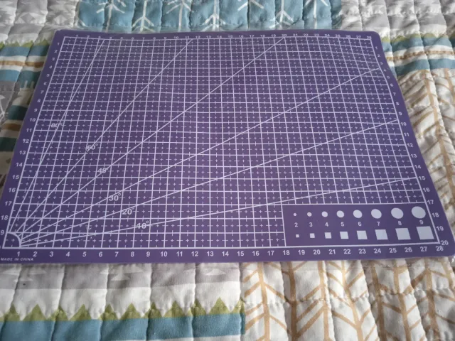 Detalles del productoTabla de corte púrpura con cuadrícula y guías angulares. Ideal para trabajos de manualidades y corte preciso.
