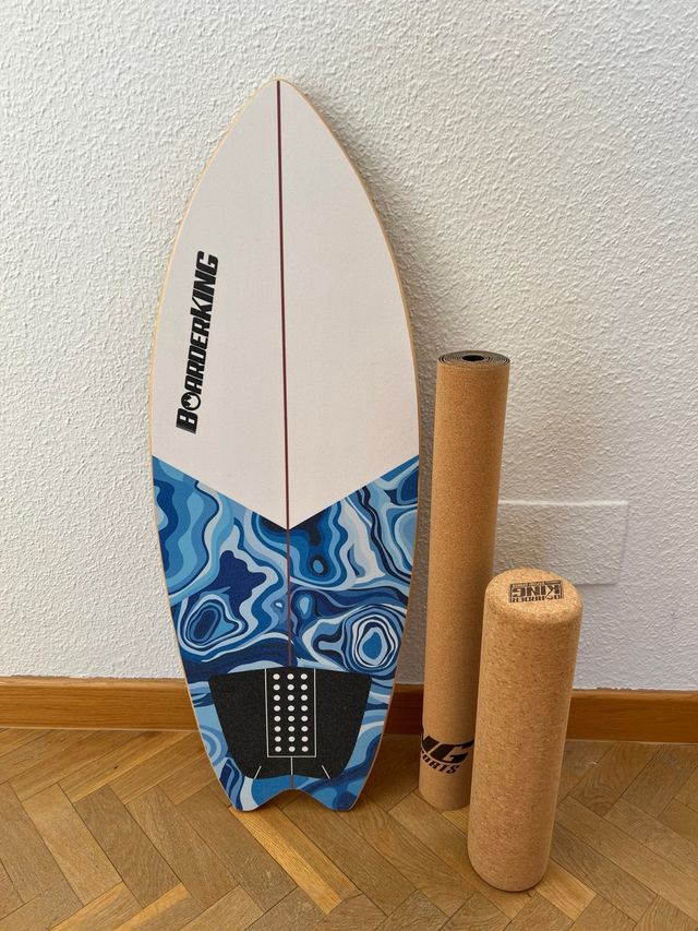 Forma tabla de surf, Madera arce, Recubierto plástico, Esterilla y rodillos de corcho, Topes desmontables, Dimensiones 32 x 5 x 88 cm