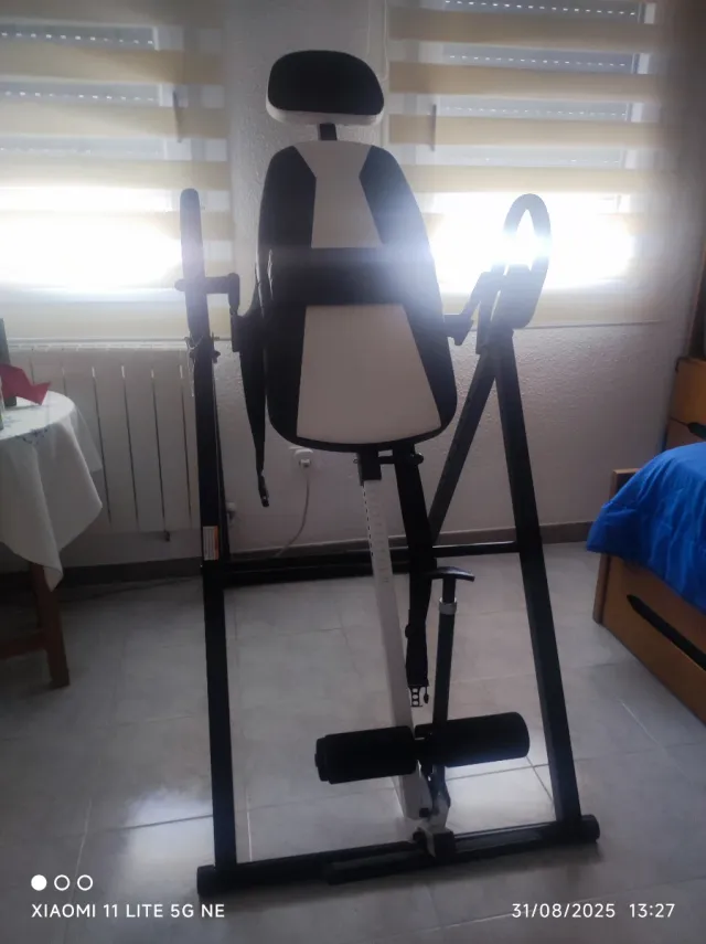 Detalles del productoTabla de inversión diseñada para la espalda. Su estructura es de color negro y el acolchado es blanco y negro.