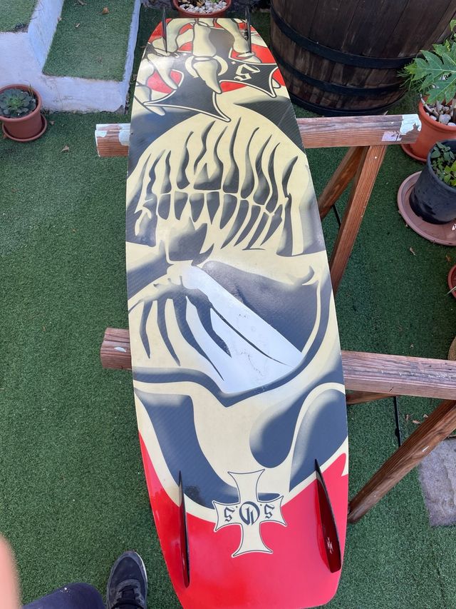 Detalles del productoTabla de kitesurf con un diseño llamativo y un pequeño golpe en el lateral.