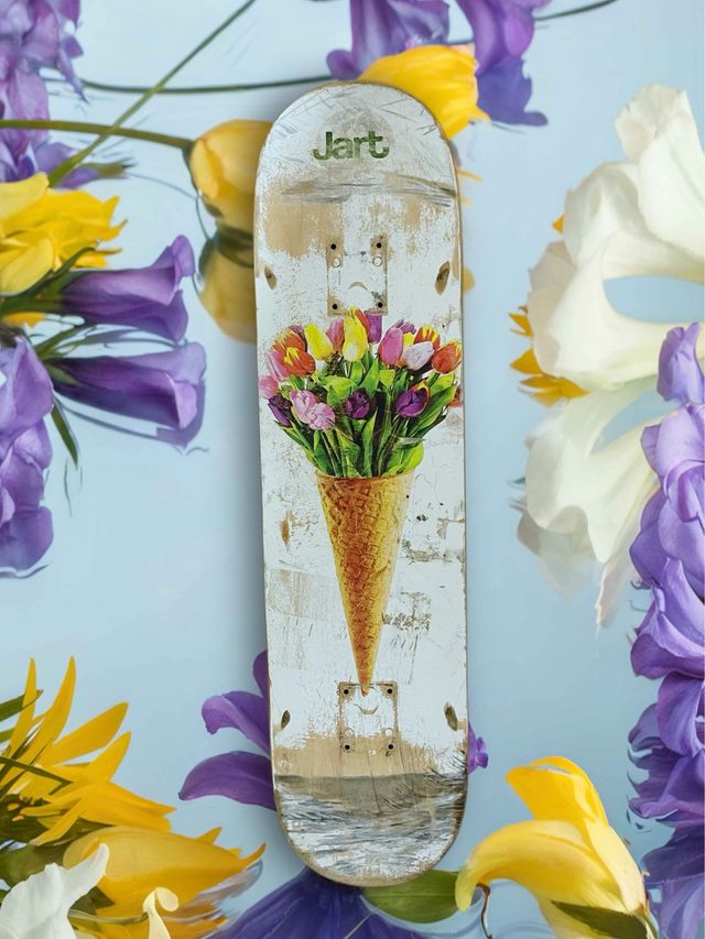 Tabla de skate Jart con diseño de flores en cono de helado, logo en la parte superior y lija Grizzly.