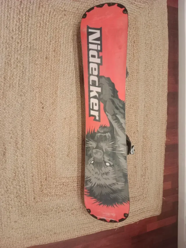 Detalles del productoTabla de snowboard Nidecker con un llamativo diseño de lobo en la parte inferior. La tabla es de color rojo en la parte superior con el logo de la marca.
