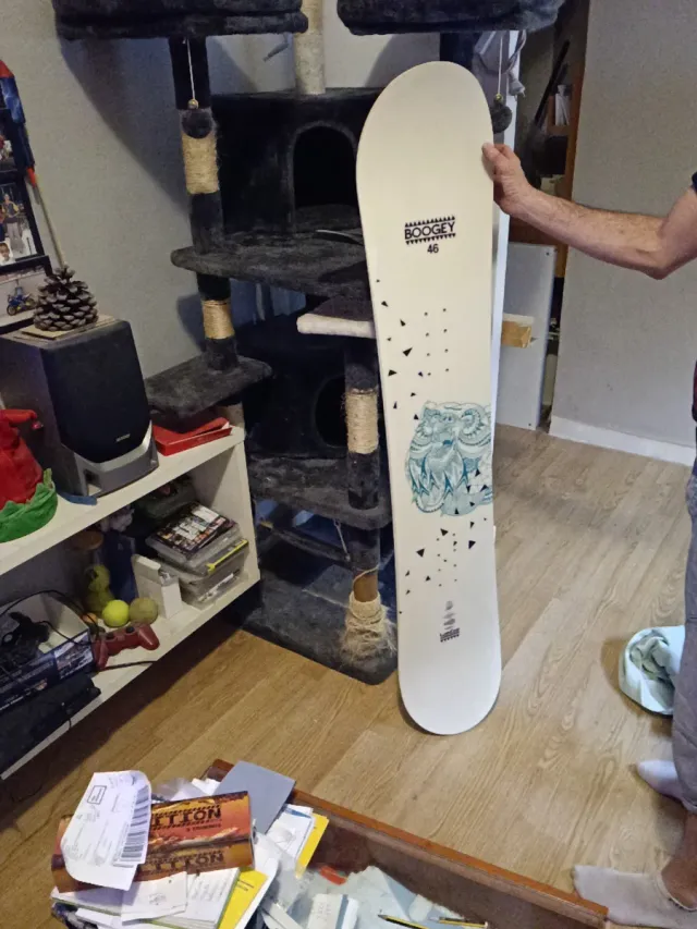 Tabla de snowboard Boogey con un diseño llamativo. - Tamaño 46. - Ilustración de búho y detalles geométricos.