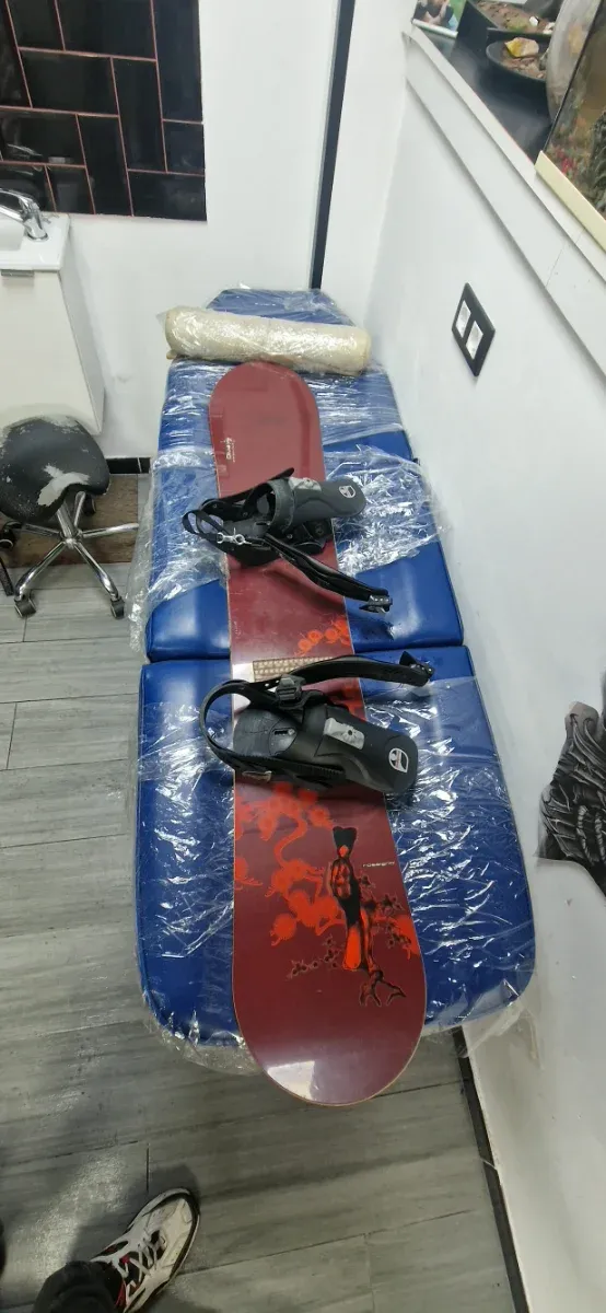 Detalles del productoTabla de snowboard lista para la acción. Presenta un diseño llamativo en color burdeos con detalles gráficos en rojo.