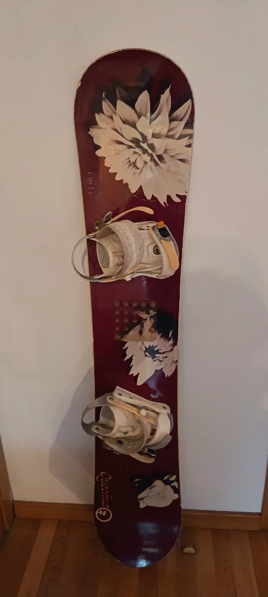 Detalles del productoTabla de snowboard con un diseño floral en tonos burdeos y blanco. Incluye fijaciones.