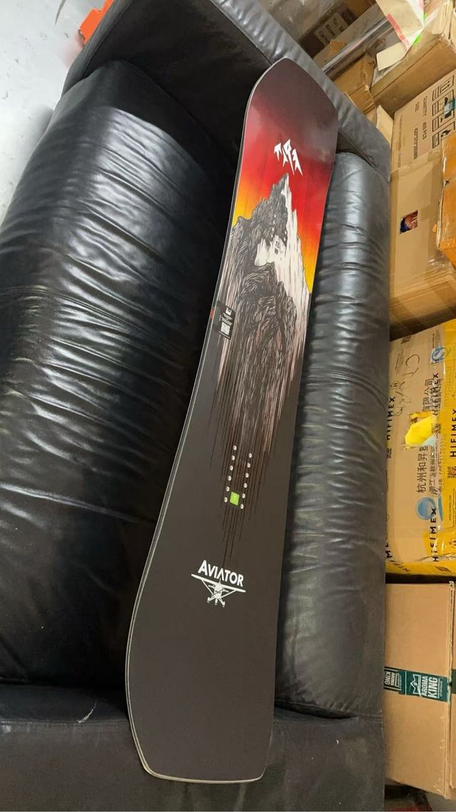 Tabla de snowboard Jones Aviator 2.0 con un diseño llamativo. - Gráficos de montaña y atardecer. - Logo AVIATOR con silueta de avioneta.