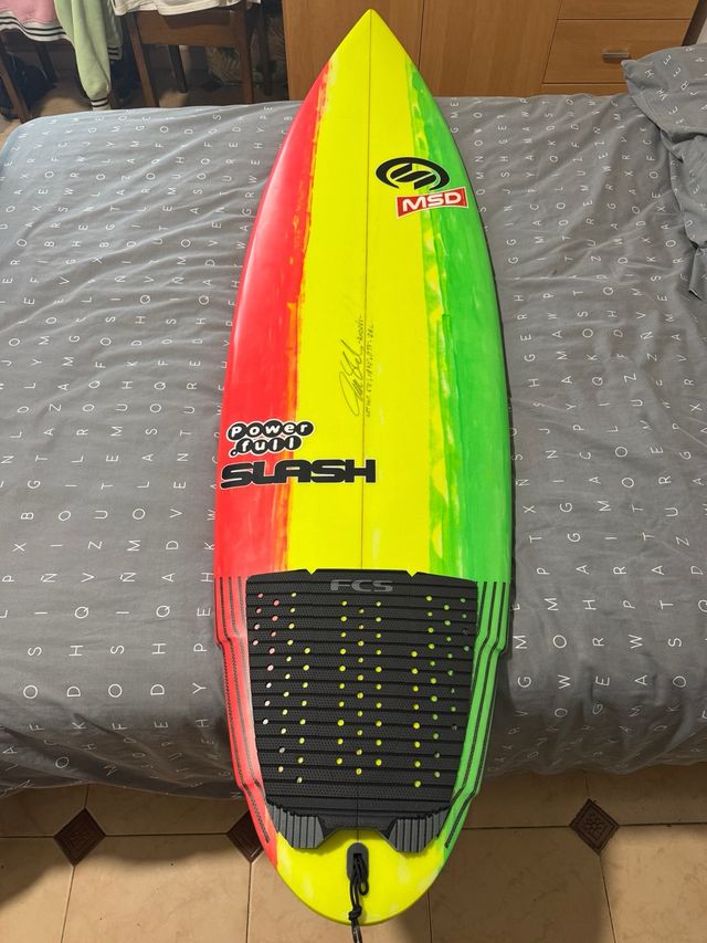 Tabla de surf con un diseño vibrante en colores rasta (rojo, amarillo, verde). - Marca: Slash - Modelo: Power full - Logo MSD - Sistema de quillas Fcs La tabla está nueva