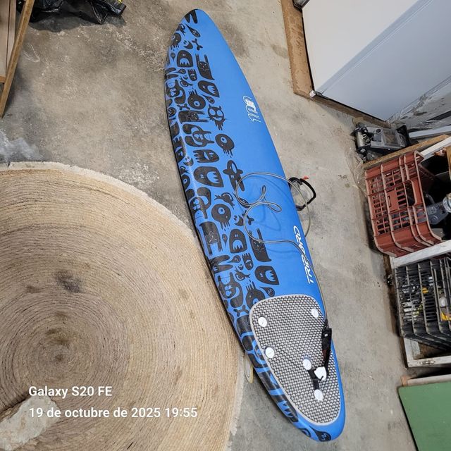 Tabla de surf de color azul con un divertido diseño gráfico en blanco. - Diseño con siluetas de criaturas. - Incluye leash.