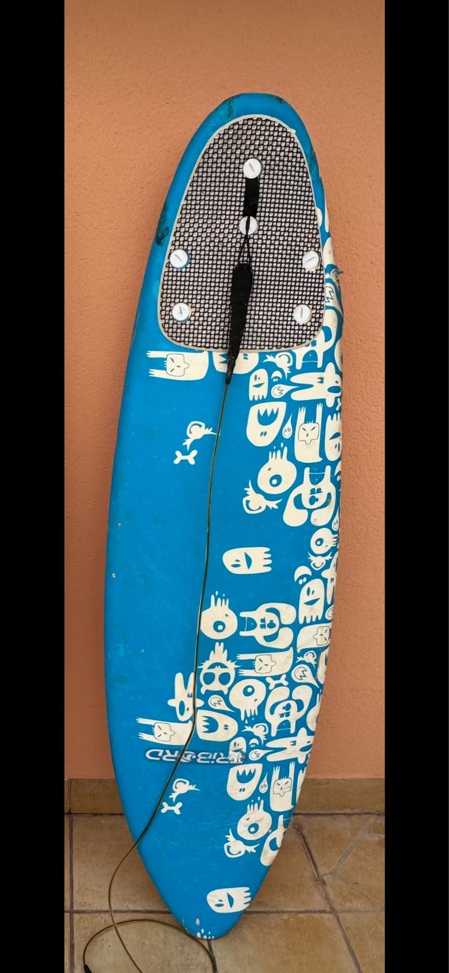 Detalles del productoTabla de surf de color azul vibrante, decorada con un llamativo diseño de personajes.