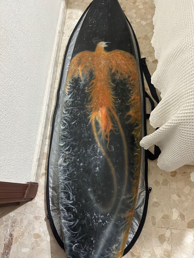 Detalles del productoTabla de surf con un diseño llamativo de ave fénix en tonos naranjas y blancos sobre fondo negro.