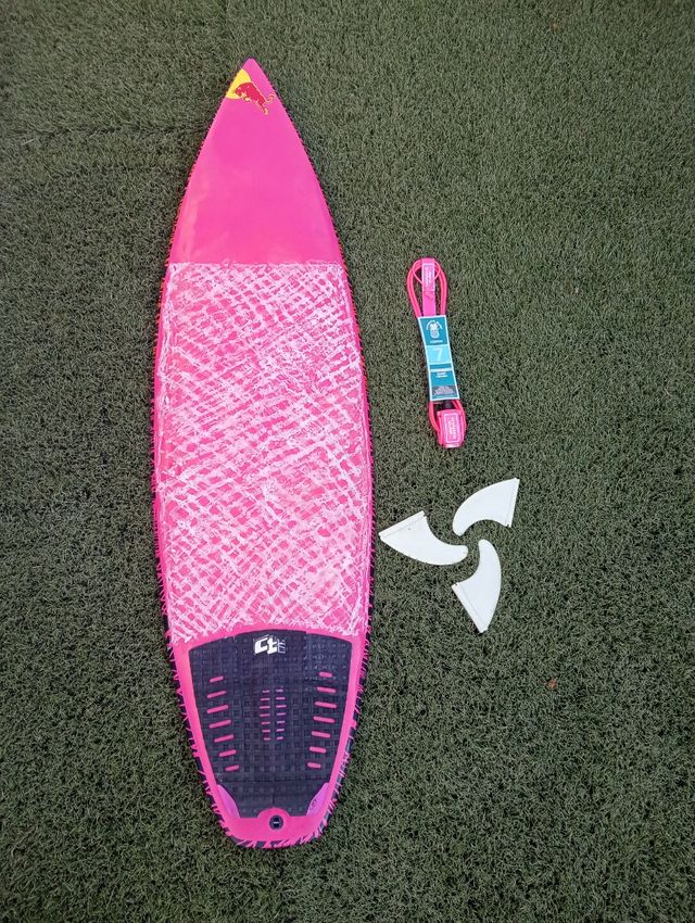Tabla de surf customizada de color rosa vibrante, lista para la acción. 5'8''-29l - Incluye tres quillas blancas. - Correa de surf rosa.
