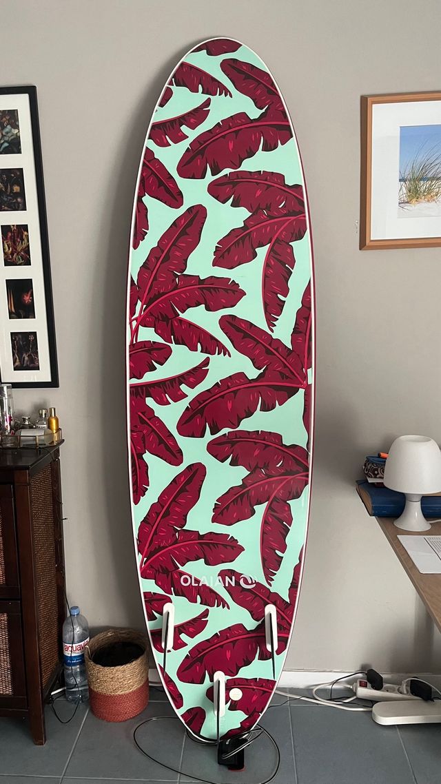 Detalles del productoTabla de surf de espuma con un diseño tropical de hojas rojas sobre fondo verde menta. Ideal para iniciarse en el surf.