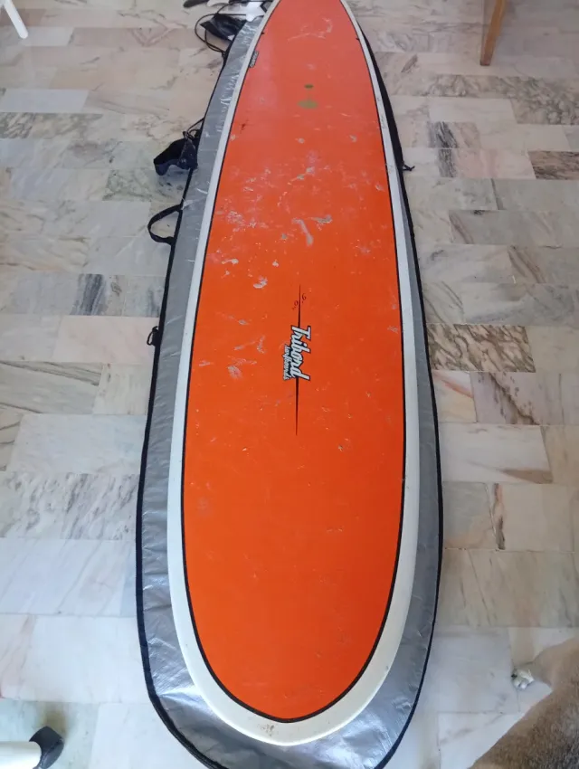 Tabla de surf tipo longboard de 9 pies de largo. Incluye funda protectora y quillas. - Color naranja con detalles blancos y negros. - Marca Tribord.