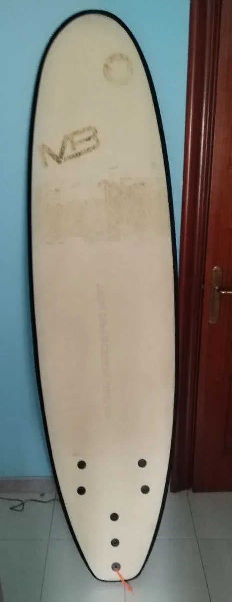 Tabla de surf de la marca MB. - Diseño blanco con borde negro. - Logo MB en la parte superior. - Seis puntos de anclaje en la parte inferior.