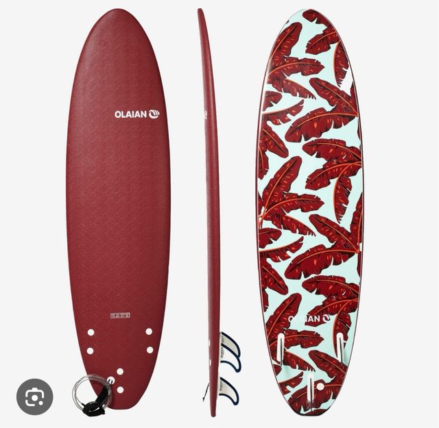Detalles del productoTabla de surf OLAIAN de goma en color rojo, tamaño 7 pies. Ideal para iniciarse en el surf.