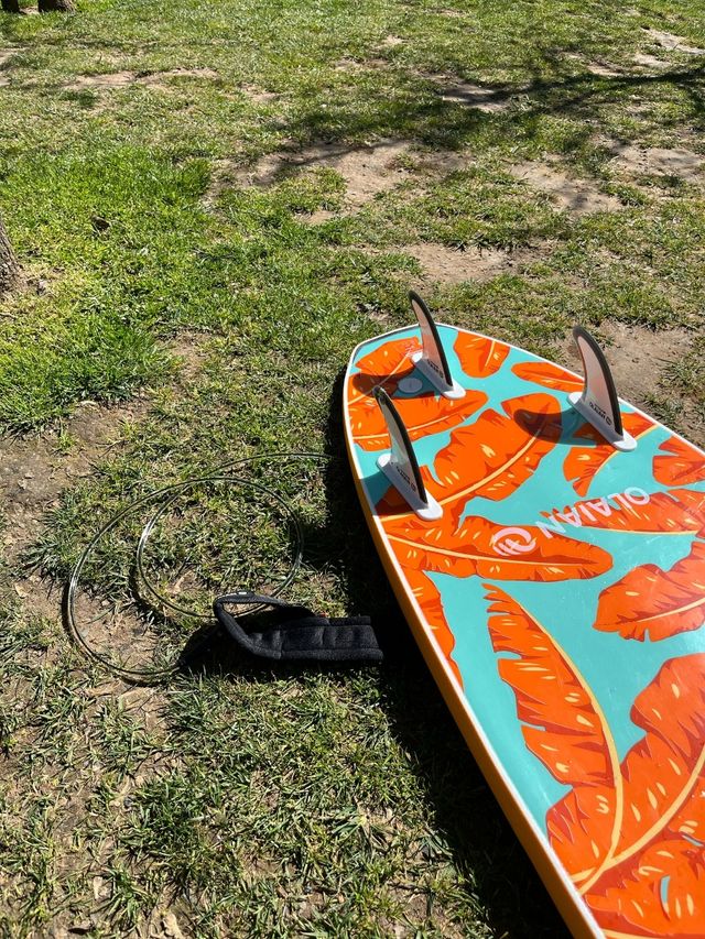 Detalles del productoTabla de surf Olaian con un diseño vibrante de hojas tropicales en tonos naranja y turquesa. Incluye las quillas y el leash. Tiene 40 litros es de 6 pies y solo tiene dos baños