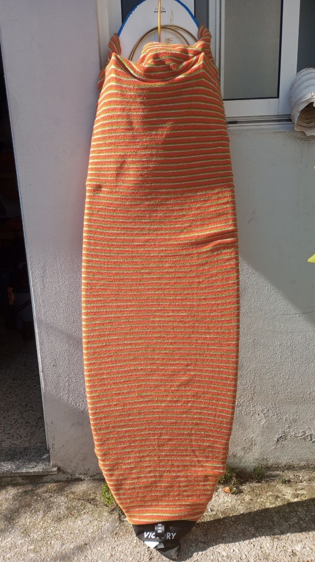 Detalles del productoTabla de surf ideal para iniciarse en este deporte. Viene con una funda protectora de rayas naranjas y verdes.