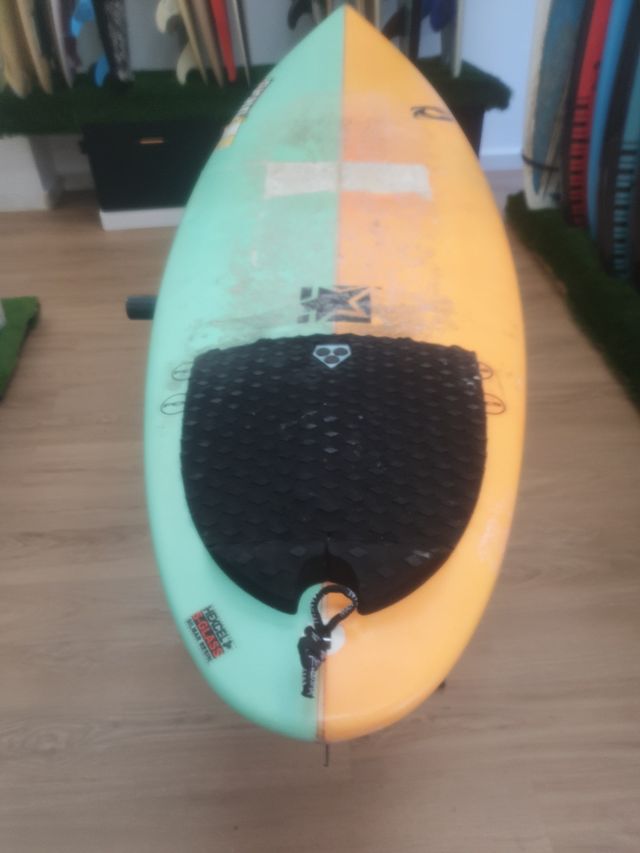 Detalles del productoTabla de surf Pukas de segunda mano, con un diseño bicolor llamativo en verde y naranja.