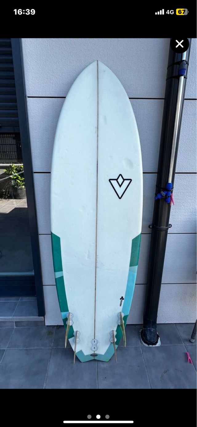Tabla de surf Venom de 6.0 pies. - Diseño blanco con detalles en verde y azul. - Logo de la marca en negro en la parte superior. - Sistema de quillas FCS. - con leash