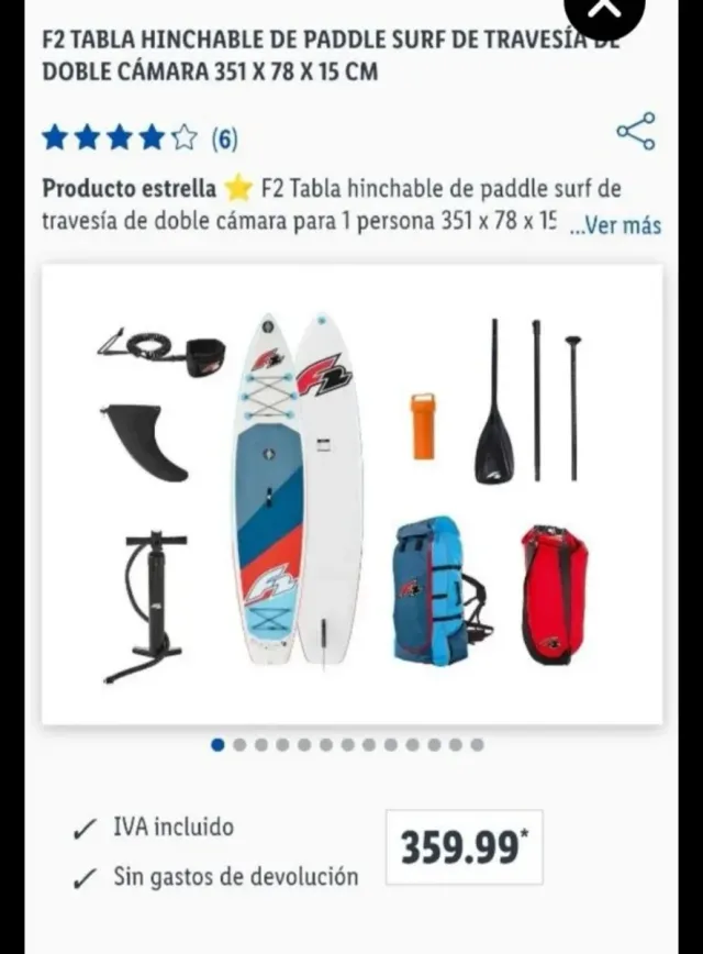 Tabla hinchable F2 para paddle surf. Ideal para disfrutar del mar y la playa. Tabla de travesía de doble cámara 351 x 78 x 15 cm. La compré de Lidl pero nunca se llegó a usar y no la voy a usar por eso la vendo. Cualquier duda puedes escribirme! Gracias
