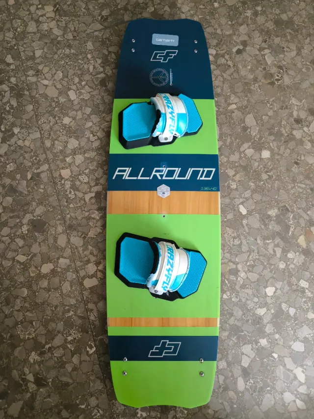Tabla de kitesurf Crazyfly modelo Allround. - Diseño en verde y azul. - Incluye fijaciones. - Logo de la marca visible. Está muy nueva