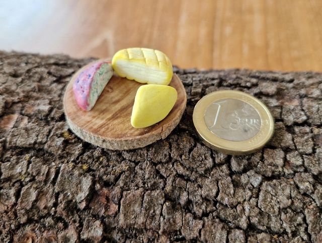 Set de quesos hechos a mano sobre una tabla de madera. Cuchillo no incluido: Cuchillo 1€ Miniatura, juguete. Figuras belen, pesebre. Casa de muñecas.