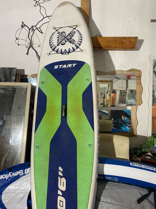 Detalles del productoTabla de pádel surf Kohala Start de 9 pies y 6 pulgadas. Diseño con zonas de agarre en verde y azul.