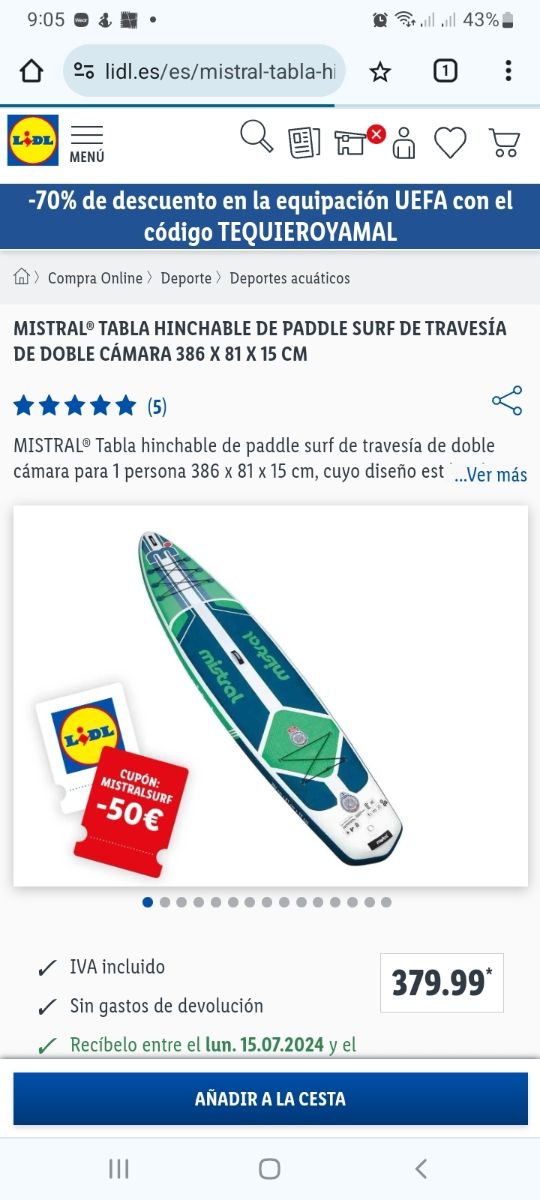 Detalles del productoTabla hinchable de paddle surf Mistral de travesía. Está prácticamente nueva y en perfecto estado. Regalo carrito transporte.