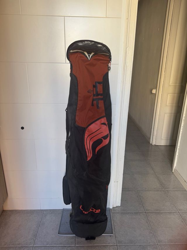 - Funda negra de la marca decathlon, forrada con protecciones y con correas. Bolsillo delantero amplio para casco y gafas