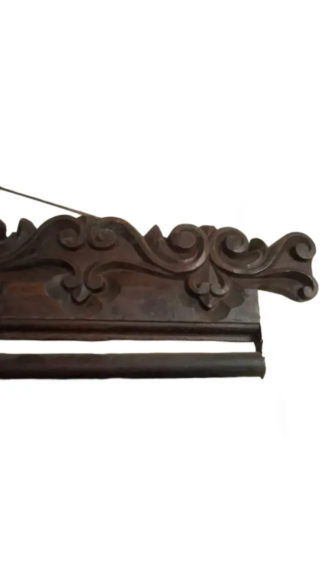 Detalles del productoTabla antigua tallada de roble. 111 cm. de largo x 18'5 cm. de alto. Sirve como decoración de puerta, para colocar un estor, o como perchero.