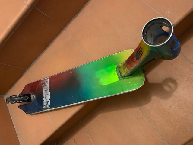 Detalles del productoTabla de scooter freestyle con un diseño degradado en colores arcoíris, que va del rojo al verde y amarillo. La parte trasera presenta un freno integrado.