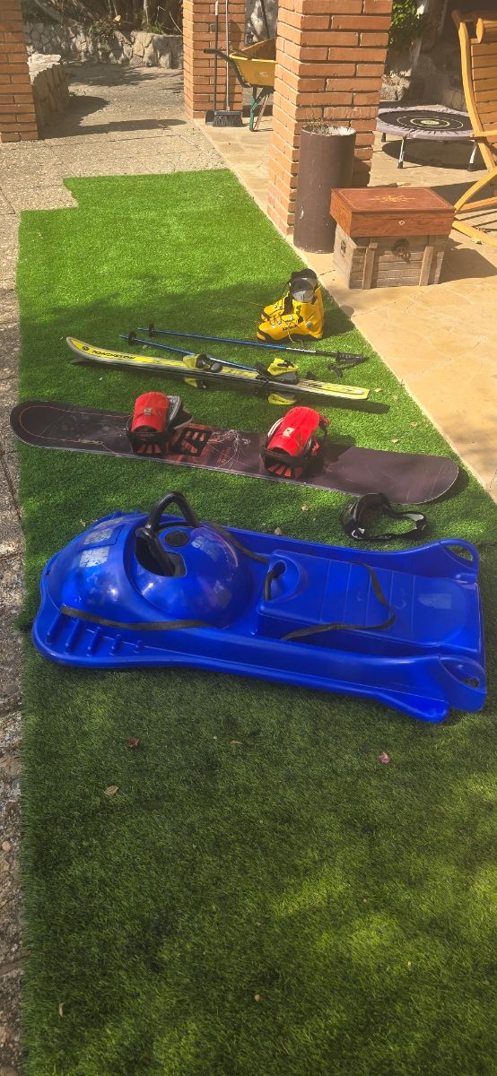 Lote de equipo para deportes de invierno. - Tabla de snowboard. - Esquís marca Rossignol con fijaciones. - Botas de esquí amarillas. -palos y gafas -trineo