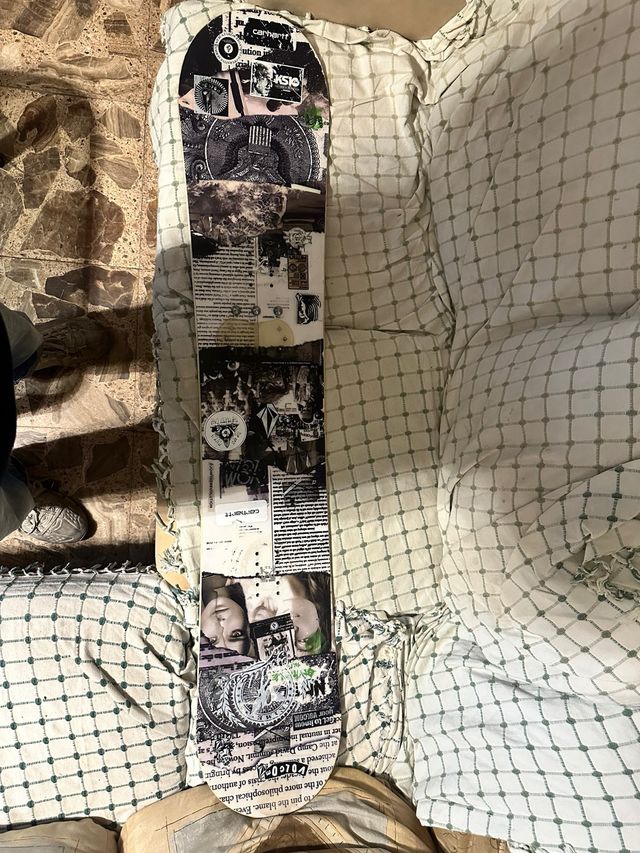 Tabla de snowboard Nitro Swindle con un diseño gráfico llamativo y collage de imágenes y textos. - Tamaño: 152 cm - Marca: Nitro.