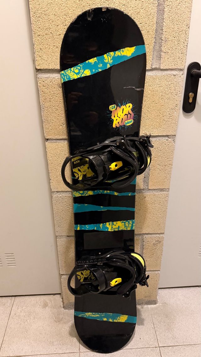Detalles del productoTabla de snowboard de 128 cm con un diseño llamativo en negro, turquesa y amarillo.